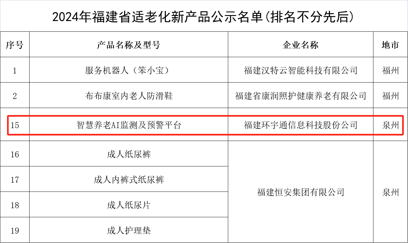 2024年11月19日,2024年福建省适老化新产品公示名单公布,全省有24款产品位列名单,泉州共有五款产品入选。其中澳客官网依托技术积累和创新能力所推出的“智慧养老AI监测及预警平台”入选该名单。这一荣誉不仅是对公司在“AI+医疗康养”领域的长期努力和贡献的肯定,更是对未来持续创新与高质量开展的激励。